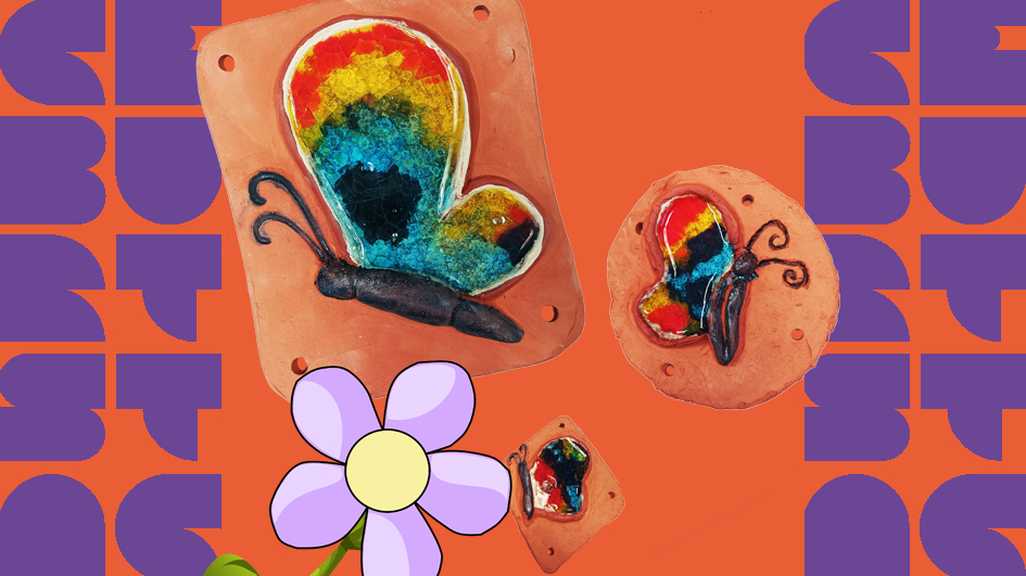 Du zeichnest und modellierst zusammen mit deiner Geburtstagsbande tolle Schmetterlinge, die in der Sommersonne umherflattern. Mit Engobe bemalt, wird das Schild später nach deiner Vorlage zusammen mit buntem Glas gebrannt. Die Glasnuggets verschmelzen dann in unserem Ofen zu einer tollen Oberfläche, die mit einem besonderen, einzigartigem Krakele ...